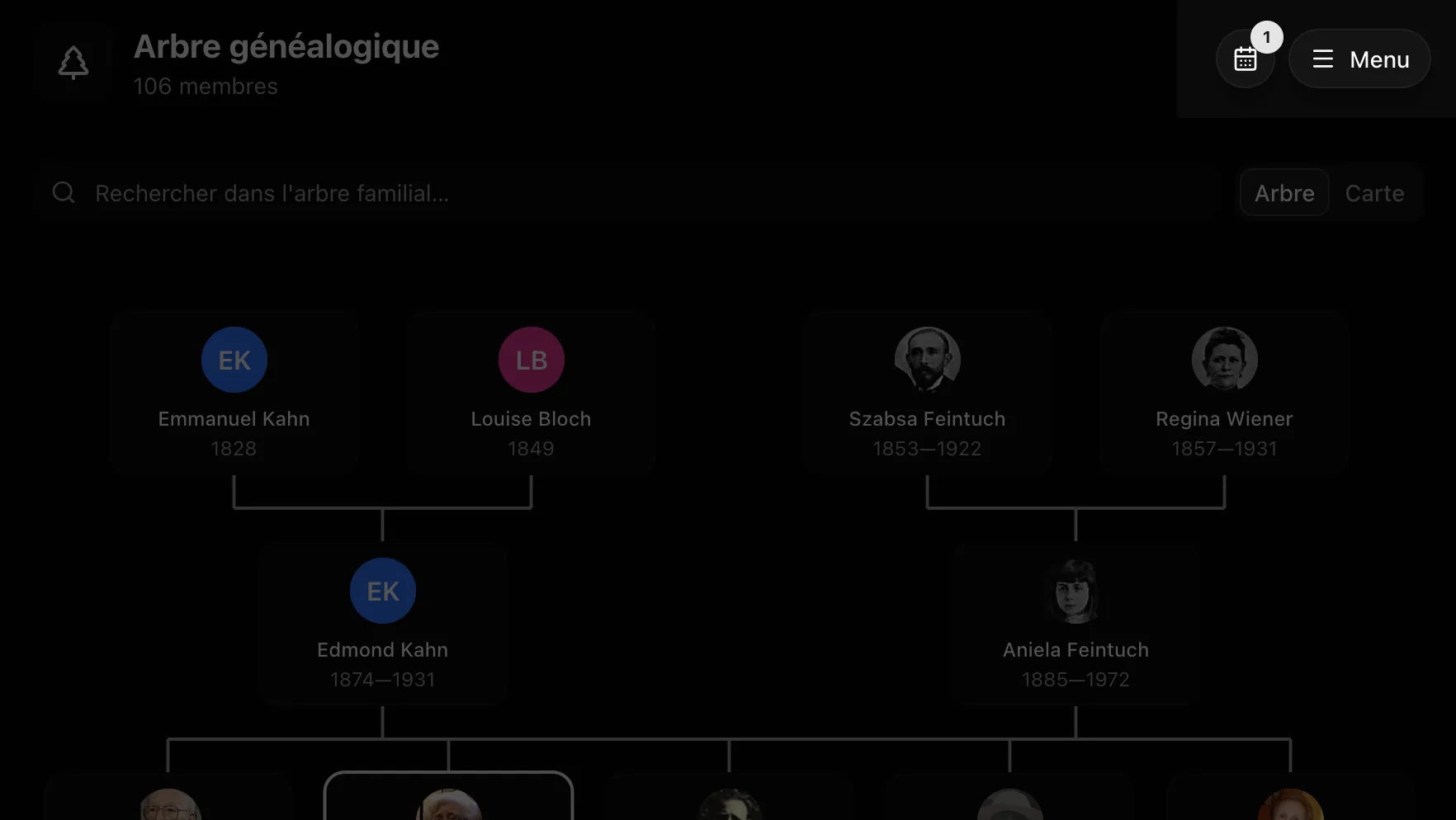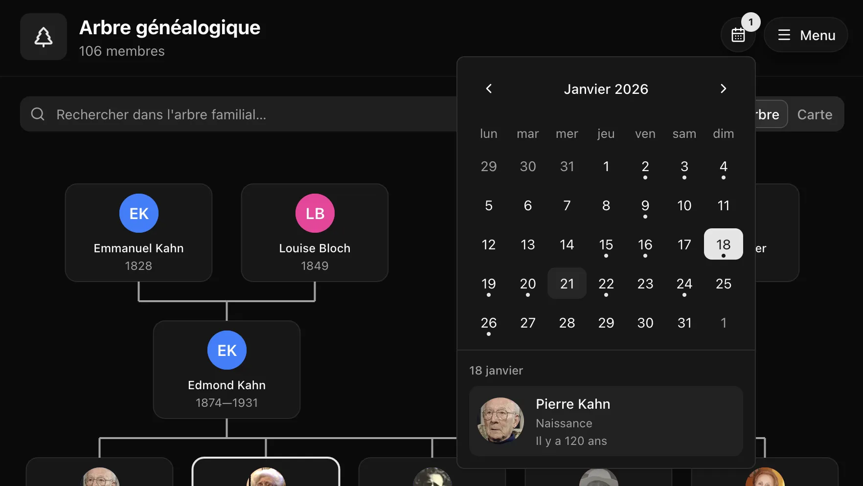 Chaque jour, le calendrier signale les événements historiques de la famille : naissances, mariages, décès, décorations… Un badge apparaît sur le bouton pour ne rien manquer.